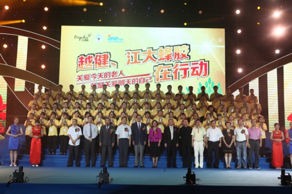 深圳市政府副秘书长盛斌先生、中国保健协会理事长张凤楼先生、中国保健协会秘书长王钟先生、广东省蜂业协会秘书长王穗生先生、深圳市保健协会秘书长黄鹤女士、江苏江大源生态生物科技有限公司董事长邵兴军博士、越健集团董事长金岩女士等领导嘉宾出席了本次盛会。与万千蜂胶爱好者一起,共同为“关爱老人”的行动添砖加瓦,共同奏响“再青春”的动人乐章!